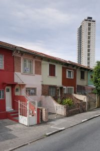 Esse contraste entre edifícios modernos e casas antigas cria uma paisagem urbana única, onde o passado e o presente convivem lado a lado.